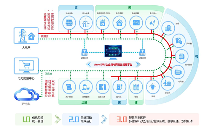 簡介:1.概述 通過在源、網、荷、儲、充的各個關鍵節(jié)點安裝監(jiān)測、分析、保護、治理裝置, 通過高性能邊緣計算網關采集數據并上傳至企業微網平臺。平臺根據新的電網價格、 用電負荷、電網調度指令等情況,調整各系統控制策略并遠程下發(fā),使企業微電網始終高效穩(wěn)定運行, 降低企業用電成本,實現能源互聯、信息互動。 2.應用場所 適用于各行業企業內部微電網管理系統的新建、擴建、改建等項目。 3.平臺結構 3.平臺功能 安科瑞AcrelEMS企業微電網能效管理平臺融合了電力監(jiān)控、電氣安全、照明控制、能源管控、充電樁運營管理、分布式光伏監(jiān)測、儲能管理、設備臺賬、運維管理等功能,通過一個平臺、一個APP整體的對企業用電進行集中監(jiān)控、統一調度、統一運維,并且根據當地供電部門錯峰避峰計劃提前為企業制定錯峰避峰方案和預警,滿足企業